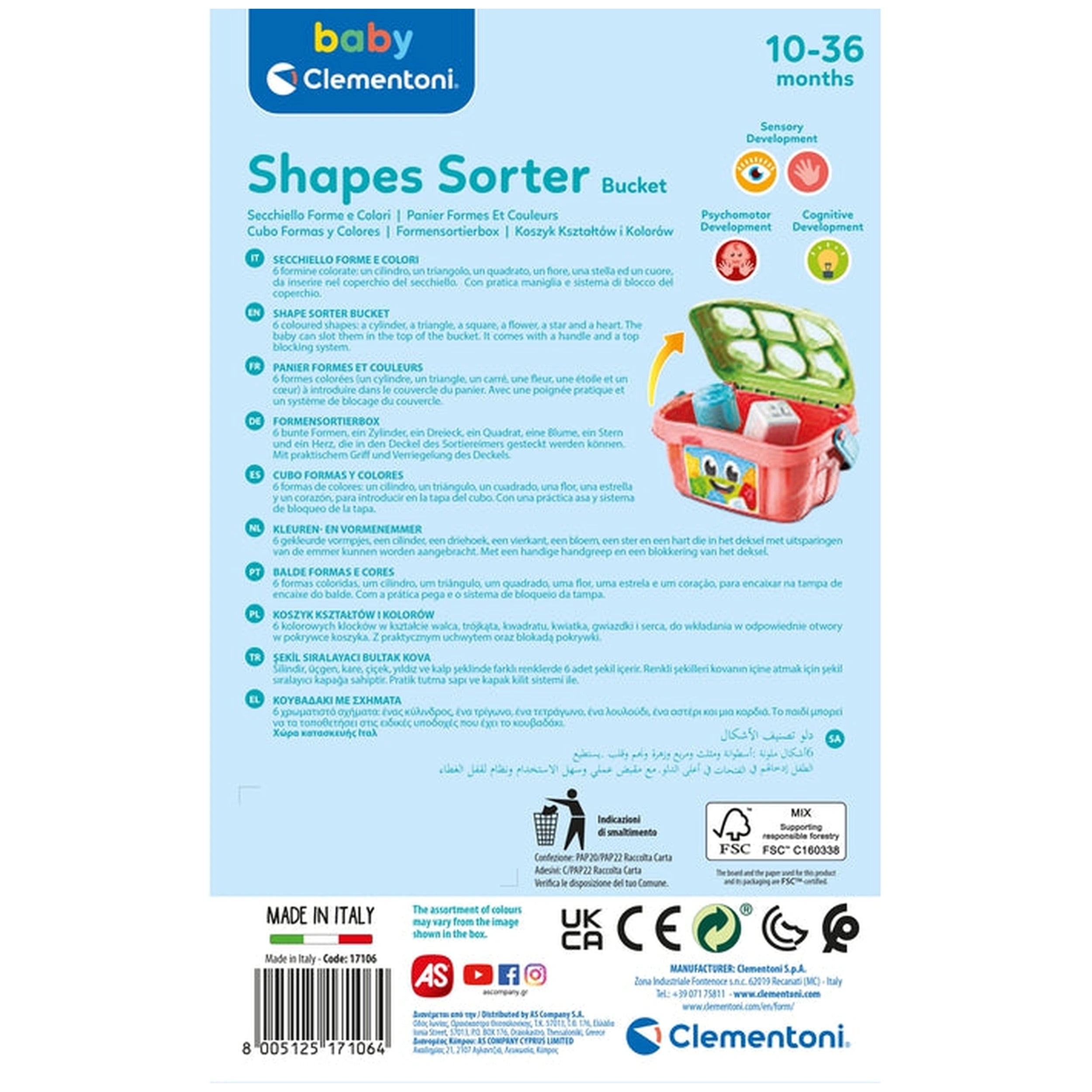 Baby Clementoni - Vormen Sorteeremmer Sorteer- en Stapel Speelgoed Maak kennis met de Baby Clementoni - Vormen Sorteeremmer, een boeiend en educatief speelgoed dat is ontworpen om jonge geesten te fascineren en tegelijkertijd essentiële ontwikkelingsvaardigheden te bevorderen. Dit heerlijke sorteer- en stapel speelgoed bevat een levendige emmer gevuld met zes uniek gevormde stukken, elk gemaakt om peuters te helpen hun eerste cijfers, vormen en kleuren te herkennen. Met zijn speelse ontwerp en interactieve elementen is de Vormen Sorteeremmer een ideale metgezel voor kinderen van 10 tot 36 maanden, waardoor leren een leuke en aangename ervaring wordt. De Vormen Sorteeremmer is niet zomaar een speelgoed; het is een hulpmiddel voor de ontwikkeling in de vroege kindertijd. Terwijl kinderen zich bezighouden met de zes kleurrijke vormen, verbeteren ze hun hand-oogcoördinatie en fijne motoriek. Het sorteren en stapelen van deze vormen stimuleert de cognitieve groei, terwijl peuters leren verschillende vormen te identificeren en te matchen, en ook het concept van oorzaak en gevolg begrijpen. Deze praktische ervaring legt de basis voor kritisch denken en probleemoplossende vaardigheden die hen in latere levensfasen ten goede zullen komen. Met het oog op praktische bruikbaarheid is de Vormen Sorteeremmer uitgerust met een handige handgreep, zodat kleintjes hun speelgoed overal mee naartoe kunnen nemen. Of het nu thuis, in het park of tijdens een speelafspraak is, deze draagbare emmer zorgt ervoor dat plezier en leren altijd binnen handbereik zijn. Bovendien heeft het veilige deksel een vergrendelmechanisme, waardoor de vormen veilig blijven en er geen ongelukken kunnen gebeuren tijdens het transport. Met zorg vervaardigd in Italië, weerspiegelt de Baby Clementoni Vormen Sorteeremmer een toewijding aan kwaliteit en veiligheid. Elk stuk is gemaakt van niet-giftige materialen, zodat kinderen vrij kunnen spelen zonder gezondheidszorgen. De levendige kleuren en boeiende vormen zijn ontworpen om de aandacht van peuters te trekken, waardoor speeltijd een spannend avontuur wordt dat hun verbeelding en nieuwsgierigheid stimuleert. Ouders zullen de educatieve waarde van de Vormen Sorteeremmer waarderen, omdat het niet alleen vermaakt, maar ook essentiële vaardigheden bij hun kinderen bevordert. Dit speelgoed is een uitstekende introductie tot basisconcepten van wiskunde en geometrie, en legt de basis voor toekomstig leren. Door verkenning en ontdekking aan te moedigen, helpt de Vormen Sorteeremmer kinderen een liefde voor leren te ontwikkelen die een leven lang meegaat. Kortom, de Baby Clementoni - Vormen Sorteeremmer is een must-have voor elke ouder die de speeltijd van hun kind wil verrijken met educatieve voordelen. Met zijn boeiende ontwerp, praktische functies en focus op vaardigheidsontwikkeling, zal dit speelgoed zeker een favoriet worden onder peuters en ouders. Mis de kans niet om uw kind een leuke en educatieve ervaring te bieden—bestel vandaag nog de Baby Clementoni Vormen Sorteeremmer en zie hoe ze gedijen terwijl ze leren door te spelen!