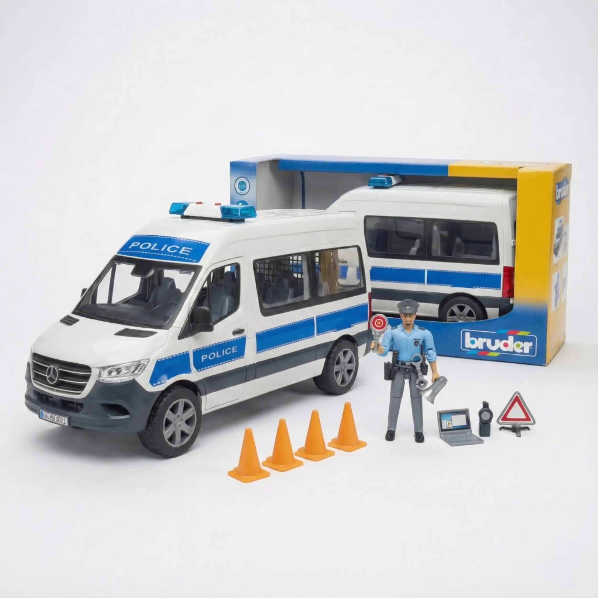 Bruder MB Sprinter police vehicle toy with officer, cones, laptop, and sign, featuring realistic details for imaginative play.
