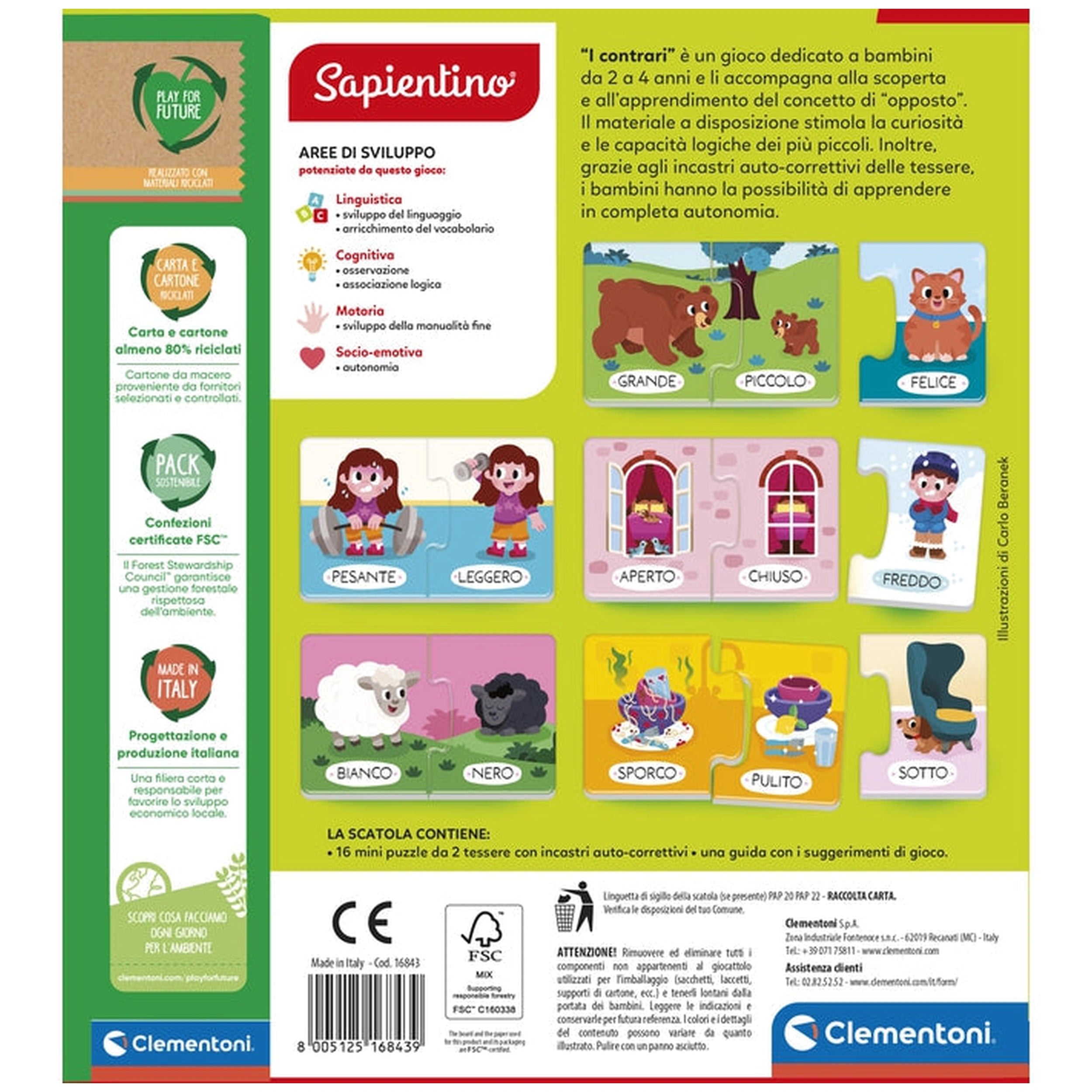 Clementoni - Sapientino I Contrari - Educatieve Speelgoed Maak kennis met de Clementoni - Sapientino I Contrari, een uitzonderlijk educatief speelgoed dat is ontworpen om jonge kinderen kennis te laten maken met de fascinerende wereld van tegenstellingen. Dit Italiaanse editie spel is zorgvuldig vervaardigd om kinderen van 2 tot 4 jaar te betrekken, en biedt hen een leuke en interactieve manier om essentiële cognitieve en taalkundige vaardigheden te leren. Met zijn levendige illustraties en intuïtieve ontwerp vermaakt dit speelgoed niet alleen, maar onderwijst het ook, waardoor het een perfecte aanvulling is op de speelroutine van elk kind. De Clementoni - Sapientino I Contrari bevat 16 prachtig geïllustreerde puzzels met twee stukken die speciaal zijn ontworpen met zelfcorrigerende vergrendelingen. Dit innovatieve ontwerp stelt kinderen in staat om zelfstandig te spelen, wat een gevoel van autonomie en zelfvertrouwen bevordert terwijl ze het concept van tegenstellingen verkennen. Elk puzzelstuk is ontworpen om naadloos in elkaar te passen, zodat kinderen gemakkelijk de relaties tussen verschillende paren van tegenstellingen kunnen herkennen en begrijpen, zoals warm en koud, groot en klein, en meer. Naast het verbeteren van de woordenschat en taalkundige vaardigheden ondersteunt dit educatieve speelgoed de ontwikkeling van logisch denken en cognitieve vermogens. Terwijl kinderen met de puzzels bezig zijn, worden ze aangemoedigd om kritisch na te denken over de relaties tussen concepten, wat een sterke basis legt voor toekomstig leren. De interactieve aard van het spel bevordert probleemoplossende vaardigheden en moedigt kinderen aan om hun gedachten en ideeën te uiten, waardoor het een onmisbaar hulpmiddel is voor de ontwikkeling in de vroege kindertijd. Clementoni staat bekend om zijn toewijding aan kwaliteit en educatieve waarde, en de Sapientino I Contrari is daarop geen uitzondering. Ontworpen, ontwikkeld en gemaakt in Italië, weerspiegelt dit speelgoed de toewijding van het merk om hoogwaardige educatieve producten te creëren die zowel boeiend als effectief zijn. Ouders kunnen erop vertrouwen dat ze hun kinderen een speelgoed bieden dat niet alleen vermaakt, maar ook bijdraagt aan hun algehele groei en ontwikkeling. De compacte afmetingen van het product (25,2 x 18 x 4,5 cm) en het lichte ontwerp (426 gram) maken het gemakkelijk op te bergen en te vervoeren, waardoor spelen onderweg mogelijk is. Of thuis, in het park of tijdens het reizen, kinderen kunnen overal leren over tegenstellingen. Deze veelzijdigheid zorgt ervoor dat leren nooit stopt, en kinderen kunnen blijven verkennen in verschillende omgevingen. Mis de kans niet om de leerervaring van uw kind te verrijken met de Clementoni - Sapientino I Contrari. Ontdek het volledige assortiment educatieve spellen van Clementoni, ontworpen voor elke fase van de ontwikkeling van een kind. Investeer vandaag nog in de toekomst van uw kind door dit boeiende en educatieve speelgoed aan hun collectie toe te voegen. Bestel nu en zie hoe ze aan een heerlijke ontdekkingsreis van leren beginnen!