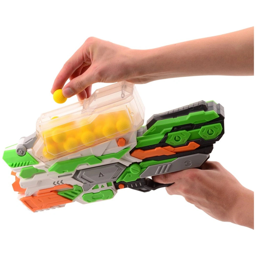 Johntoy - Tack Pro Power Shot I Met 30 Ballen 36Cm - Buitenspeelgoed Maak kennis met de Johntoy Tack Pro Power Shot I, een opwindend buitenspeelgoed dat is ontworpen om de speelervaring van uw kind naar een hoger niveau te tillen. Deze indrukwekkende Rival blaster heeft een lengte van 36 cm en is perfect voor kinderen van 8 jaar en ouder. Met zijn levendige groene, zwarte en oranje ontwerp, aangevuld met wit en grijs, ziet de Tack Pro Power Shot I er niet alleen fantastisch uit, maar biedt ook een actievolle avontuur dat kinderen urenlang bezig houdt. Het opvallende kenmerk van de Tack Pro Power Shot I is het innovatieve hopperontwerp, dat eenvoudig laden van tot 30 Rival rondes mogelijk maakt. Dit betekent minder tijd besteden aan herladen en meer tijd genieten van de spanning van het spel. De boven gemonteerde hopper is gebruiksvriendelijk, zodat zelfs jongere spelers snel weer in de actie kunnen komen. Laad simpelweg de ballen, trek aan de priming hendel en je bent klaar om een stortvloed van plezier te ontketenen. Wat de Tack Pro Power Shot I onderscheidt van andere blasters is de compatibiliteit met Rival rondes van verschillende merken. Deze veelzijdigheid zorgt voor een naadloze integratie in elke bestaande collectie buitenspeelgoed, waardoor het een fantastische aanvulling is voor gezinnen die graag competitief spelen. Of het nu gaat om een vriendschappelijke strijd in de achtertuin of een groter buitenevenement, deze blaster is ontworpen om te presteren. Veiligheid heeft altijd prioriteit, en de Tack Pro Power Shot I is vervaardigd uit duurzame materialen die de ontberingen van buitenspel kunnen doorstaan. Het ontwerp zorgt ervoor dat het lichtgewicht maar robuust is, wat zorgt voor een gemakkelijke hantering en manoeuvreerbaarheid. Ouders kunnen gerust zijn, wetende dat hun kinderen spelen met een product dat aan de veiligheidsnormen voldoet en tegelijkertijd een opwindende ervaring biedt. Naast zijn indrukwekkende kenmerken moedigt de Tack Pro Power Shot I fysieke activiteit en sociale interactie onder kinderen aan. Buitenspelen bevordert niet alleen de fitheid, maar stimuleert ook teamwork en strategisch denken terwijl kinderen hun eigen spelplannen bedenken en tegen elkaar strijden. Deze blaster is meer dan alleen een speelgoed; het is een hulpmiddel voor het opbouwen van vriendschappen en het creëren van blijvende herinneringen. Mis de kans niet om de buitenspeeltijd van uw kind te verbeteren met de Johntoy Tack Pro Power Shot I. Met zijn eenvoudige laadsysteem, compatibiliteit met verschillende Rival rondes en robuuste ontwerp, zal deze blaster zeker een hit zijn. Voorzie uw kind van urenlang plezier en avontuur—bestel de Tack Pro Power Shot I vandaag nog en zie hun verbeelding de vrije loop!