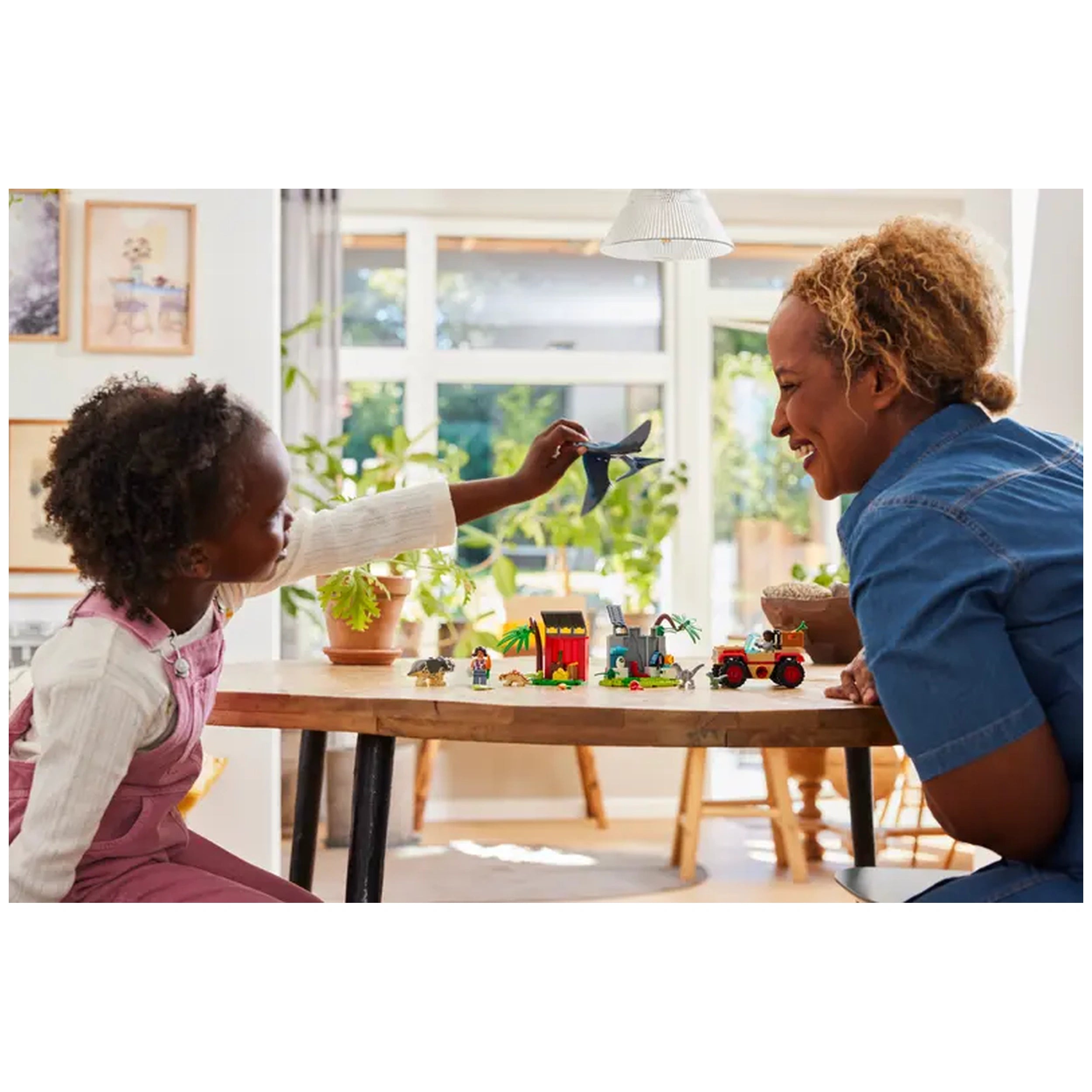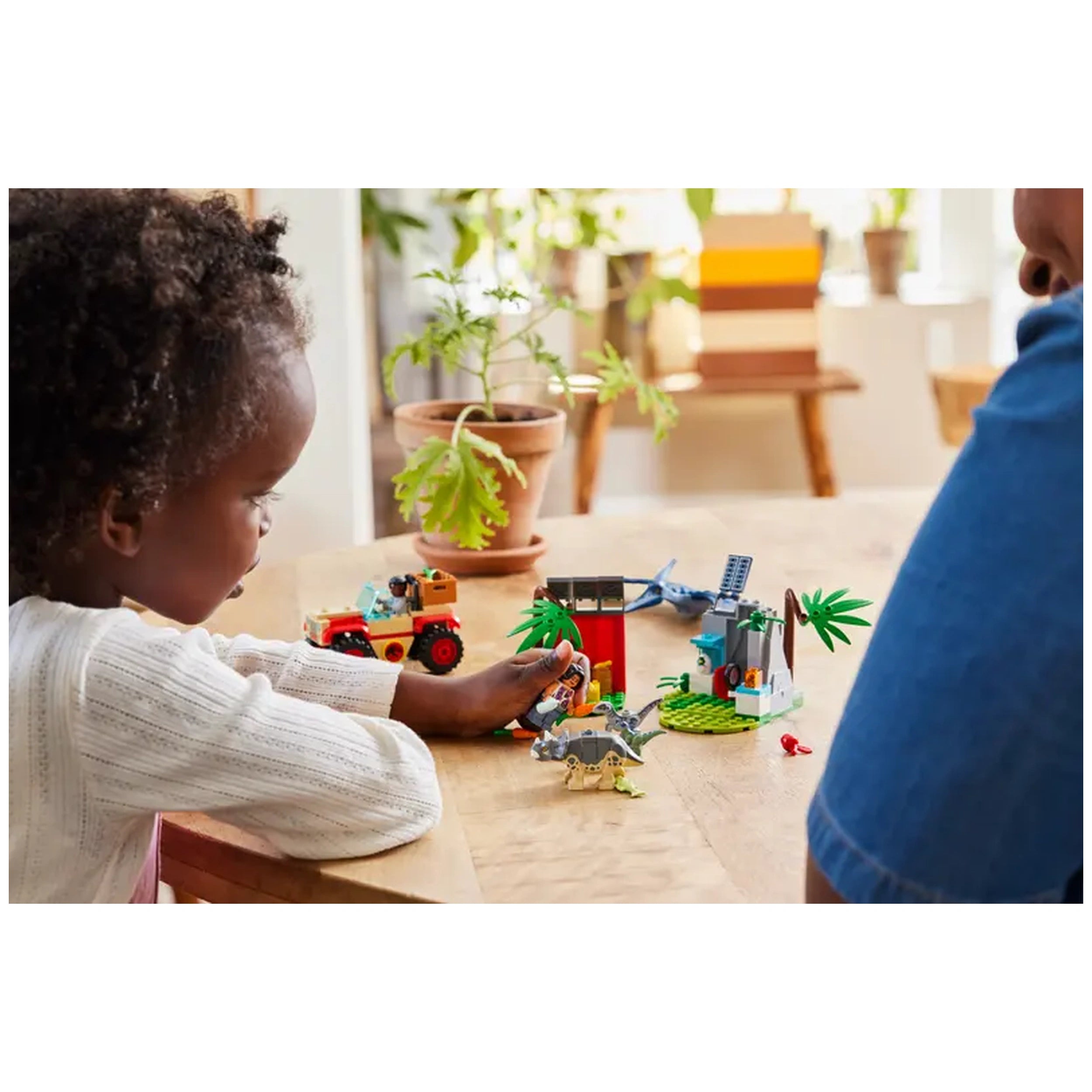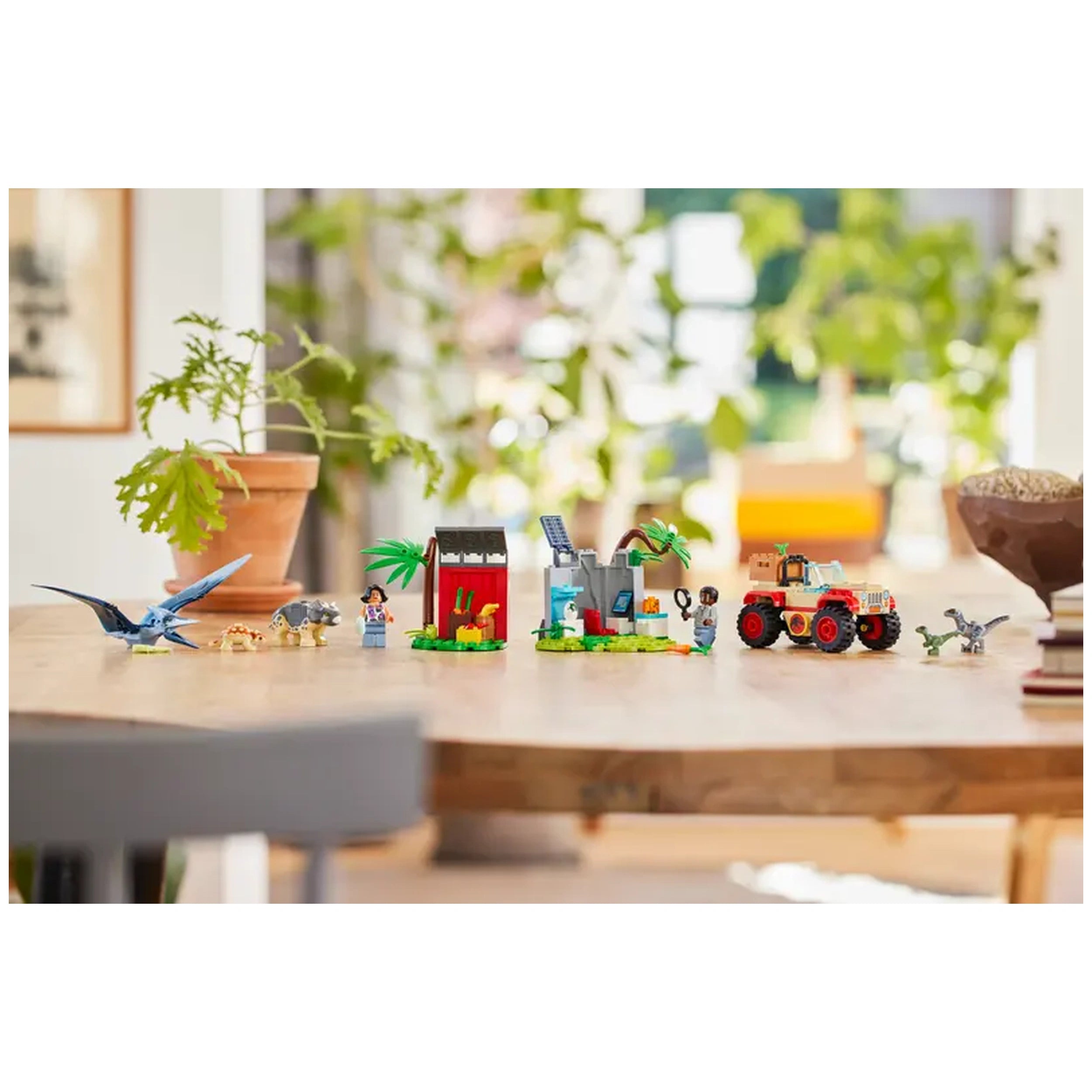 The LEGO® Jurassic World Baby Dinosaur Rescue Centre is packed with features that enhance the play experience. The research area is equipped with solar panels and a computer workstation, providing a realistic setting for kids to conduct their dinosaur research. The feeding area, complete with a shed wall, adds another layer of interaction, allowing children to simulate the nurturing of their dinosaur friends. This multifaceted playset not only entertains but also educates, promoting storytelling and problem-solving skills.