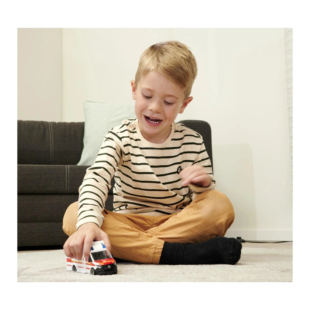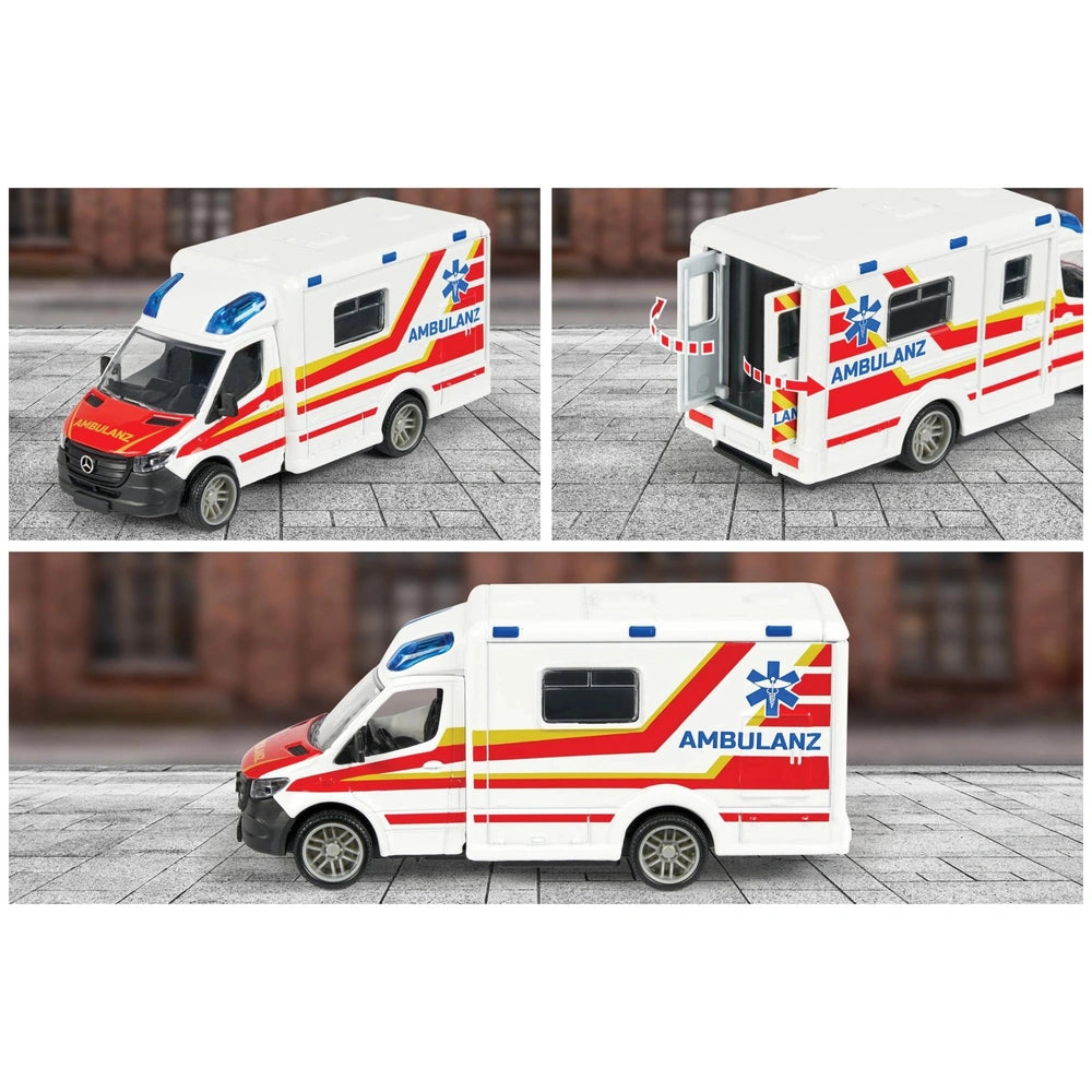 Introducing the Majorette Mercedes-Benz Sprinter Ambulance, a captivating toy designed for children aged 3 and up. This 15 cm long ambulance is not just a plaything; it’s a gateway to imaginative rescue scenarios and thrilling adventures. Crafted with precision, this officially licensed Mercedes-Benz model features a robust metal cabin, ensuring durability and longevity. The attention to detail in its design, including authentic German ambulance lettering, makes it a standout addition to any child's toy collection.