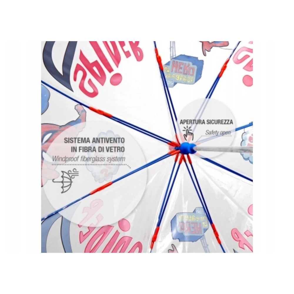 De Perletti Marvel Spider-Man Kids Transparante Paraplu is een heerlijk accessoire dat somber weer transformeert in een kans voor fantasierijk spel. Met een lengte van 65 cm is het perfect afgestemd op kleine handjes, zodat kinderen het gemakkelijk kunnen hanteren. De paraplu toont een opvallend "Spider Power"-ontwerp, dat de essentie van de iconische web-slinger vastlegt, wat niet alleen beschermt tegen regen, maar ook creativiteit en opwinding inspireert.