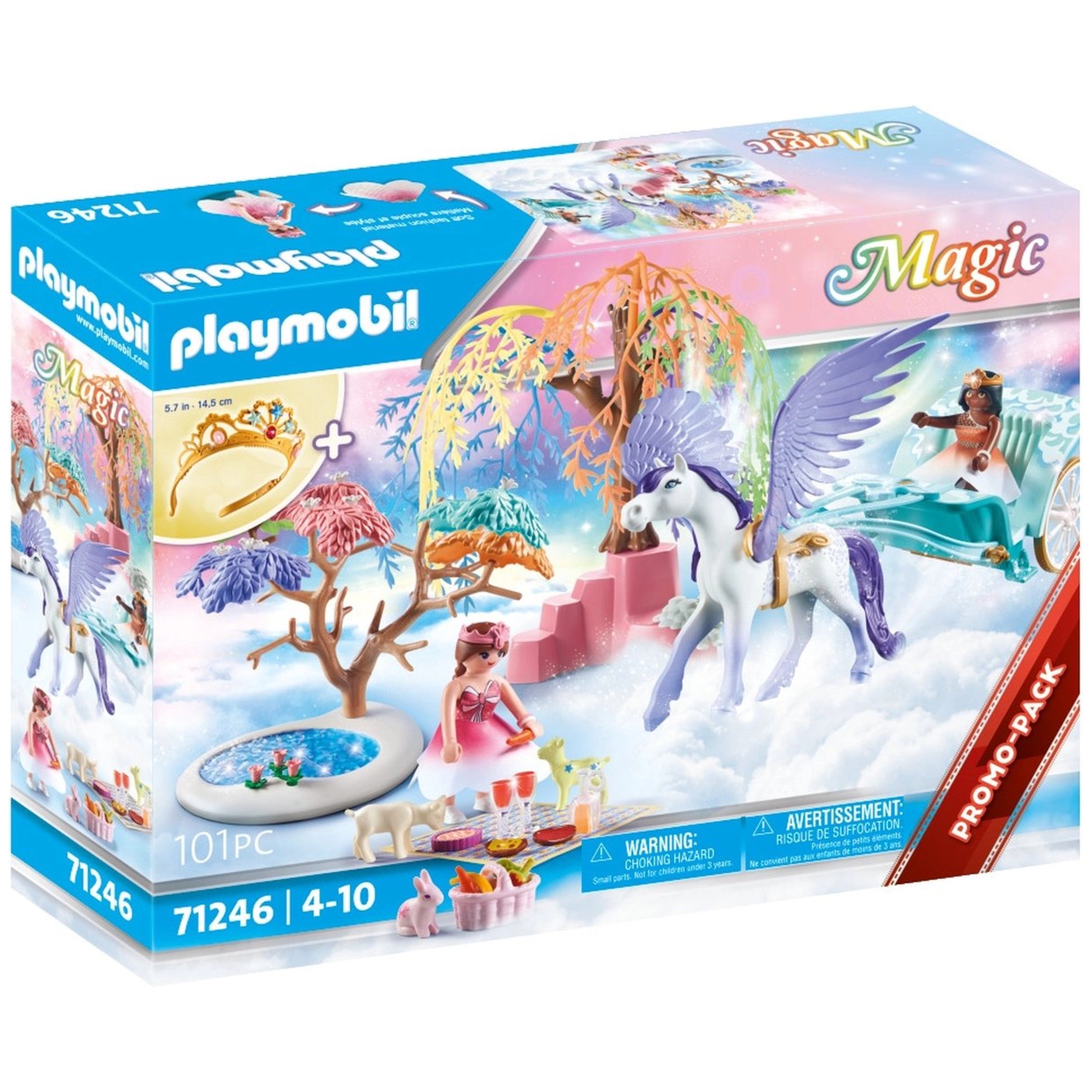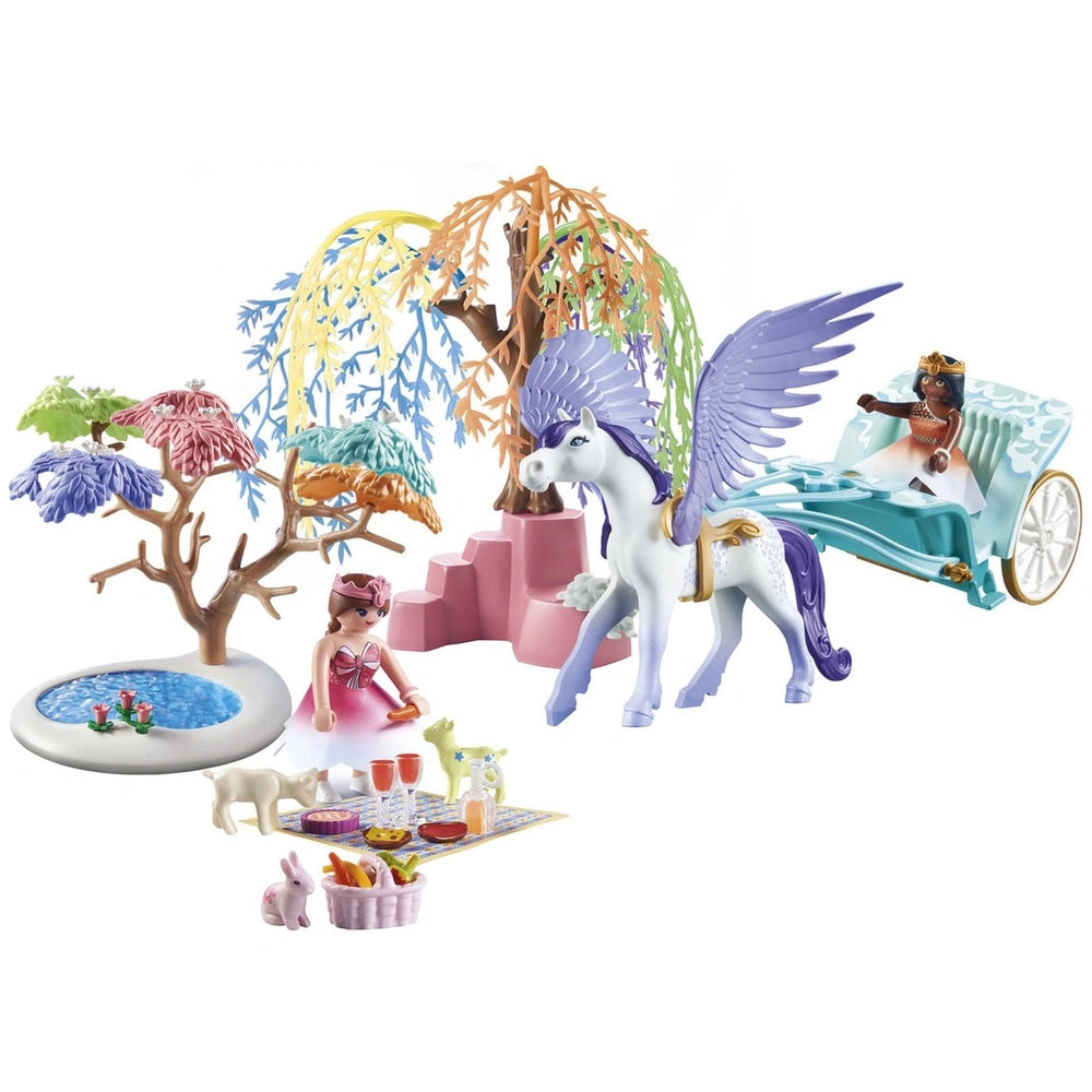 The Playmobil Magic Picnic set includes a total of 101 pieces, ensuring endless fun and exploration. Children will be thrilled to discover the beautifully crafted Pegasus, which serves as the centerpiece of their adventure. Accompanying the princesses are a playful rabbit and two adorable children, adding to the charm and excitement of the picnic. The set also features a vibrant rainbow tree adorned with flowers and a serene pond, creating a picturesque backdrop for their magical outing.