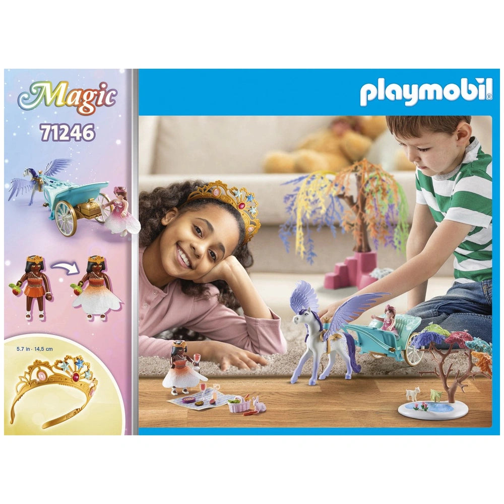 Introducing the enchanting "Playmobil Magic Picnic With Pegasus Carriage," a delightful playset designed to transport children into a world of imagination and adventure. This captivating set invites young minds to embark on magical journeys alongside two charming princesses as they explore the skies in their shimmering Pegasus carriage. With its intricate details and engaging characters, this playset is perfect for children aged four and up, fostering creativity and storytelling through imaginative play.