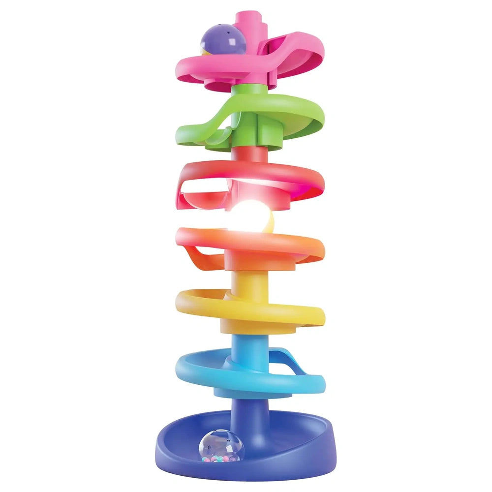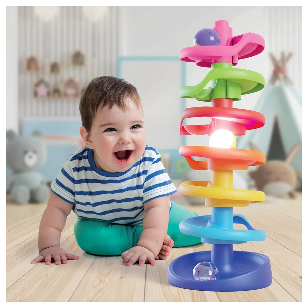De Spiral Tower Brightball is maar liefst 46 cm hoog en heeft zeven eenvoudig te monteren niveaus, die een dynamische spiraalvormige baan creëren voor drie gespecialiseerde ballen. Elke bal is ontworpen om onmiddellijke sensorische feedback te geven: een bewegingsgeactiveerde lichtbal die oplicht, een doorzichtige bal gevuld met confetti die rattelt, en een levendige multicolor bal. Deze combinatie vermaakt niet alleen, maar helpt ook bij het ontwikkelen van essentiële vaardigheden zoals hand-oogcoördinatie en ruimtelijk inzicht.