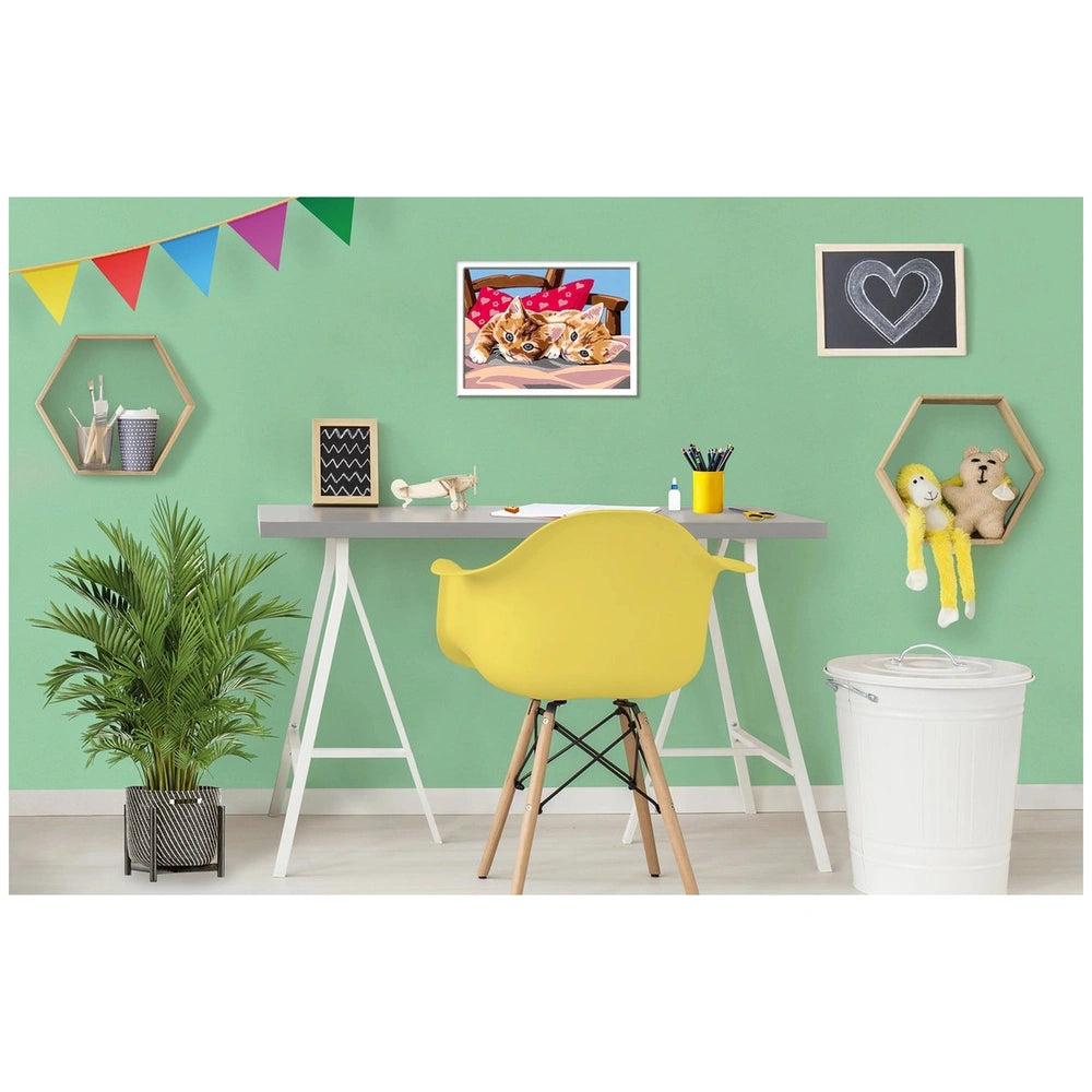 The Ravensburger CreArt Two Cuddly Cats set includes everything you need to embark on your artistic journey. Inside the box, you will find high-quality, water-based acrylic paints neatly packaged in numbered jars, a brush for precise application, a palette for mixing colors, and a pre-printed canvas featuring the charming image of the two cuddly cats. Each section of the canvas is clearly marked with numbers corresponding to the paint colors, making it easy to follow along and fill in the designated areas. This thoughtful design allows even beginners to achieve impressive results.