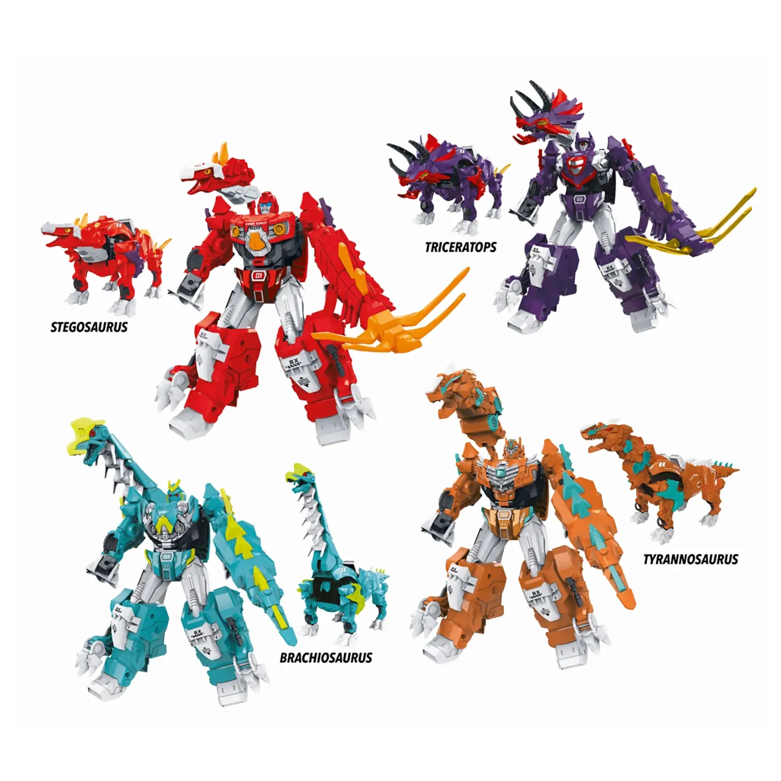 Each robot in this remarkable series is an "IMPRENDIBILE JURASSIC MACHINE" capable of transforming into one of the most iconic dinosaurs. This unique feature provides double the fun, allowing children to engage in dynamic play as they switch between powerful robots and fierce dinosaurs. The set includes a striking main robot in vibrant green and blue, accompanied by a collection of equally impressive transformable robots, including the Brachiosaurus, Tyrannosaurus, Triceratops, and Stegosaurus.
