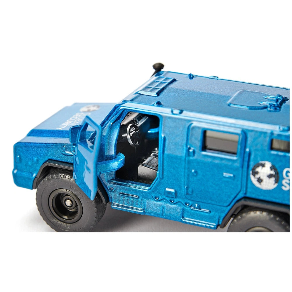 The Siku Money Transporter is finished in a sleek metallic blue, exuding an air of professionalism and discretion. The "Global Security" logo emblazoned on its sides adds to its authentic appearance, making it a standout piece in any collection. The vehicle's design includes functional doors on both sides and at the rear, allowing for interactive play and easy access to its secure compartment. Children can engage in imaginative scenarios, simulating the transport of precious cargo while learning about the importance of security and responsibility.