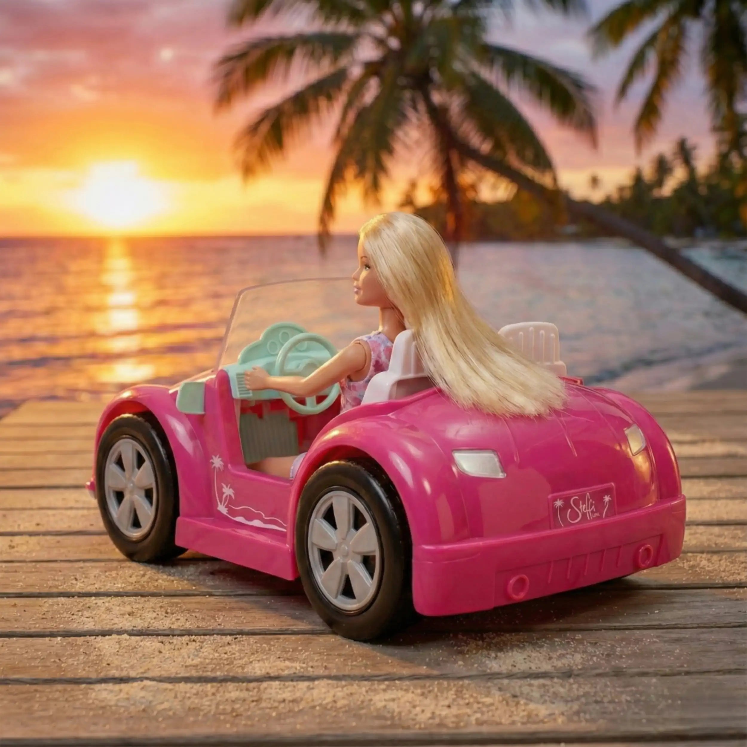 The Steffi LOVE Beach Car set includes not only the charming Steffi doll but also an array of accessories that enhance the play experience. The pink convertible is designed with attention to detail, featuring a sleek design that appeals to young fashionistas. The car's vibrant color and stylish features make it a standout piece in any toy collection. Children can easily place Steffi in the driver's seat, allowing them to create their own stories and adventures as they navigate through their imaginative worlds.