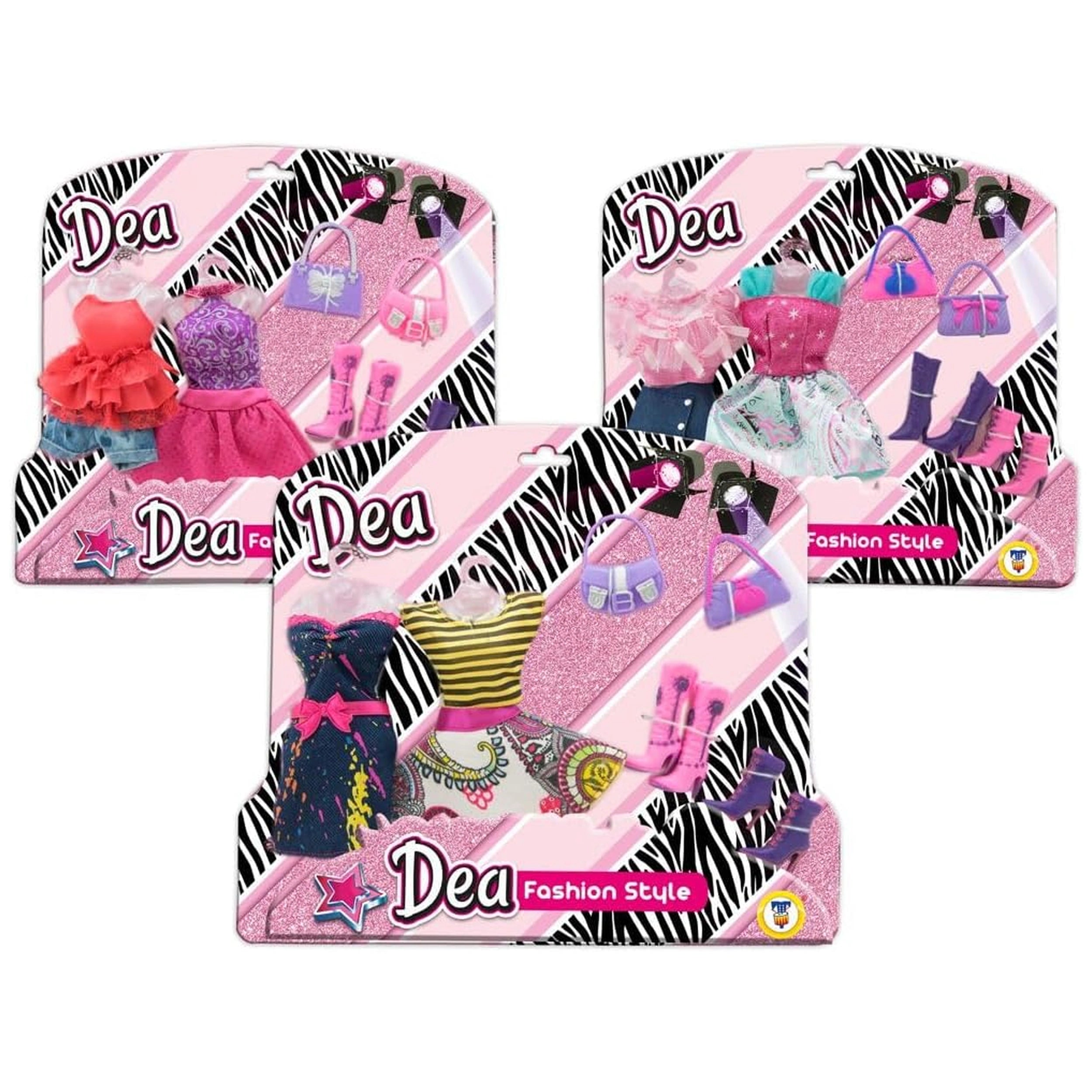 The Dea Fashion Style Doll Outfit Set includes a variety of outfits that cater to different tastes and occasions. Each blister pack features at least one complete outfit, which may consist of layered dresses, chic skirts, or trendy denim pieces. This diversity ensures that children can mix and match to create unique looks for their dolls, fostering an environment of creativity and self-expression. The vibrant textiles and eye-catching designs are sure to captivate young minds, making every dressing session an exciting adventure.