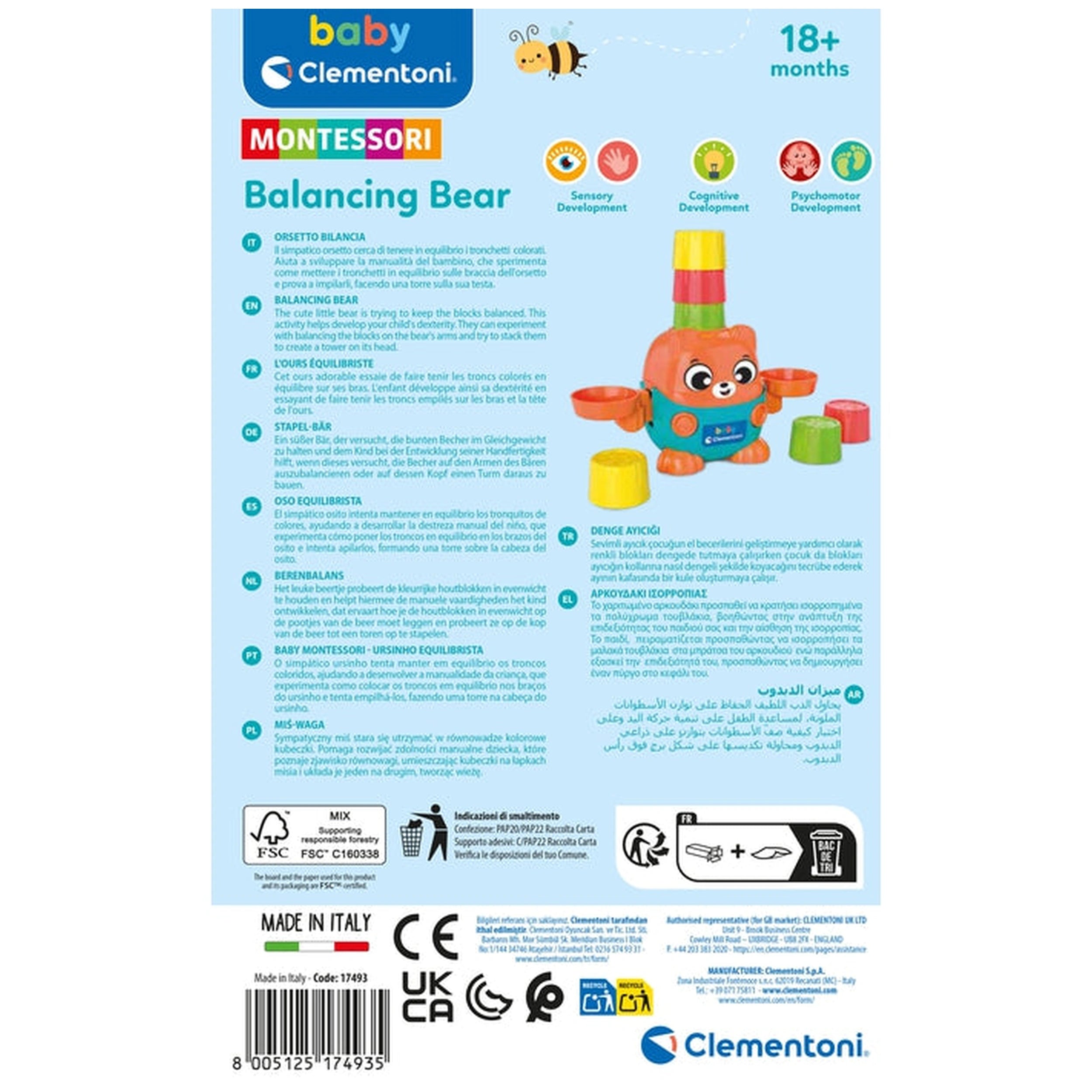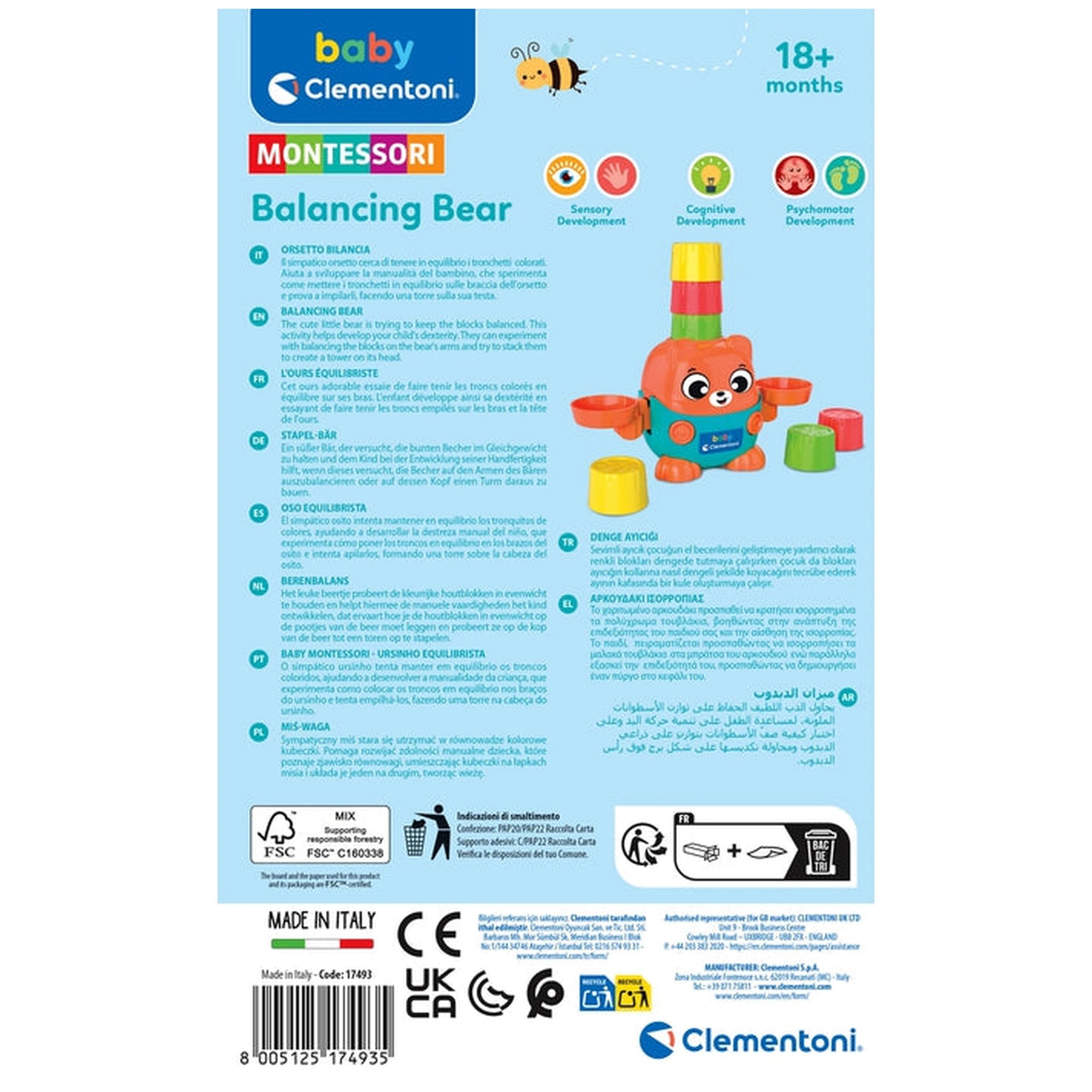 Introducing the Baby Clementoni - Balancing Bear Sorting & Stacking Toys, a delightful and educational toy designed to engage young minds while fostering essential developmental skills. This innovative toy features a charming bear with outstretched arms that serve as a balance scale, inviting children to explore the concepts of weight and equilibrium through playful interaction. Crafted with care and inspired by the Montessori method, this toy is perfect for children aged 18 months and older, making it an ideal choice for early learning.