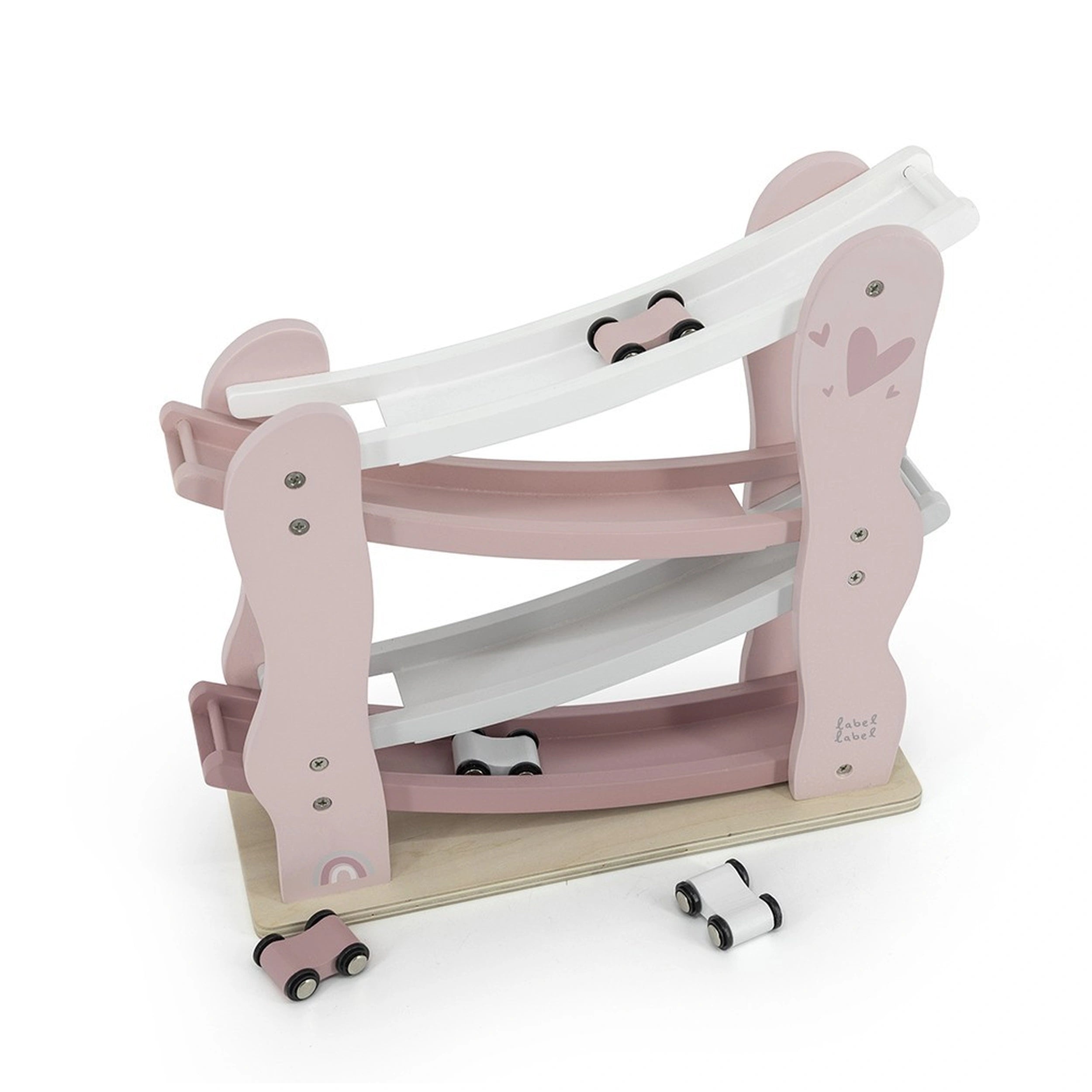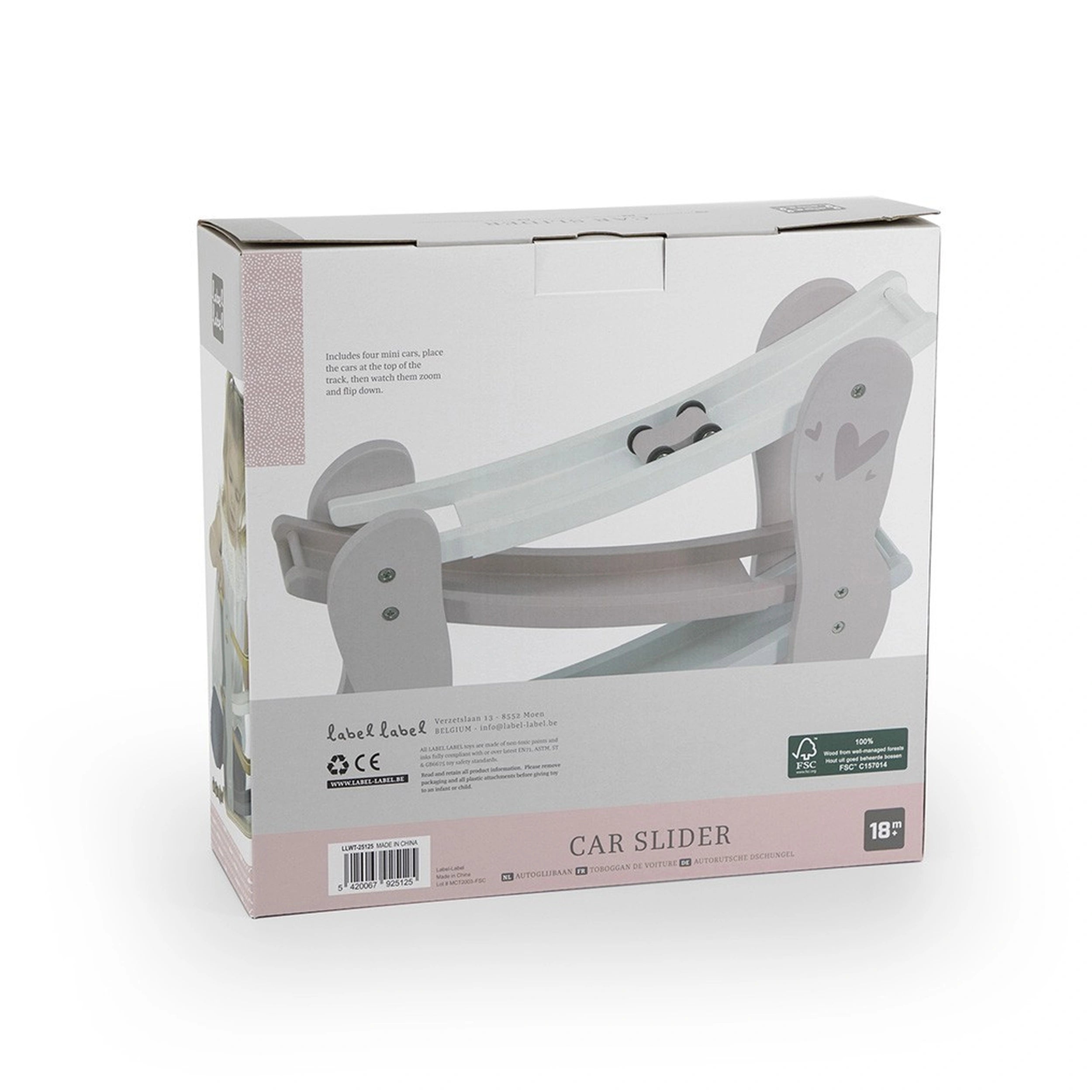 The Label Label Car Slider features a smooth slide that allows four charming cars, included in matching colors, to race down and navigate turns. This engaging activity encourages children to explore their motor skills as they learn to place the cars on the slide and watch them zoom down. The excitement of racing fosters a sense of competition and camaraderie, making it an ideal toy for playdates or family bonding time.