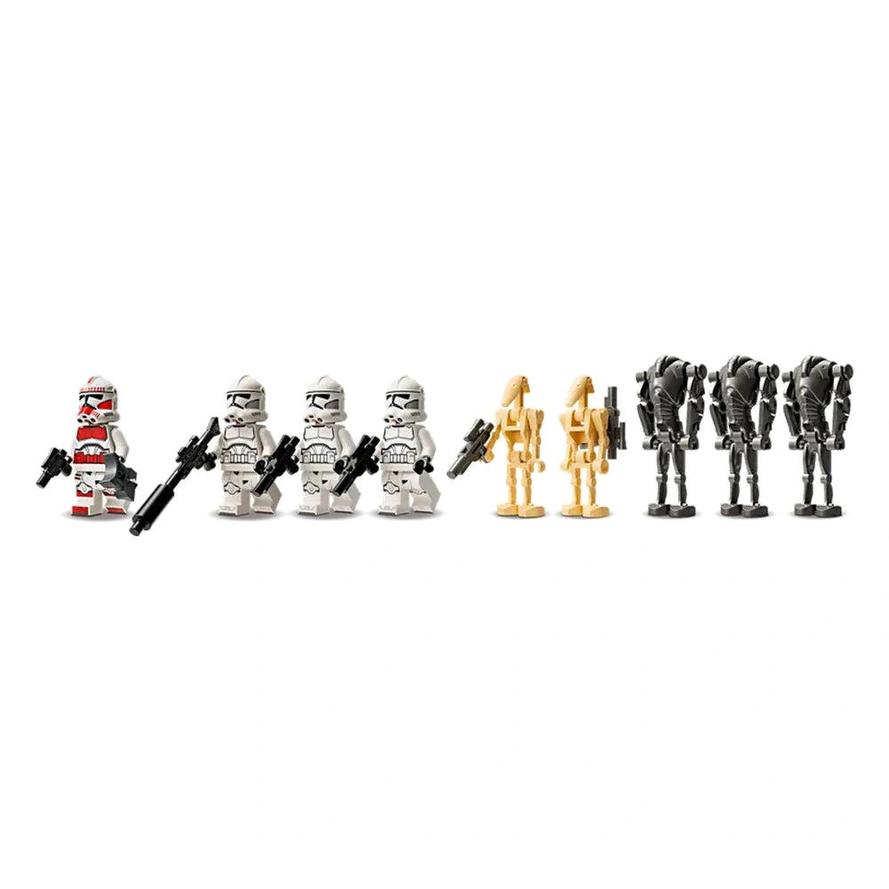 The LEGO Clone Trooper & Battle Droid Battle Pack features a total of 4 LEGO Star Wars minifigures and 5 additional LEGO figures, including a Clone Shock Trooper, three Clone Troopers, three Super Battle Droids, and two Battle Droids. Each character comes equipped with iconic weapons, allowing for dynamic action play that mirrors the epic battles seen in the series. The inclusion of these detailed figures not only enhances the play experience but also encourages storytelling and role-playing among young fans.