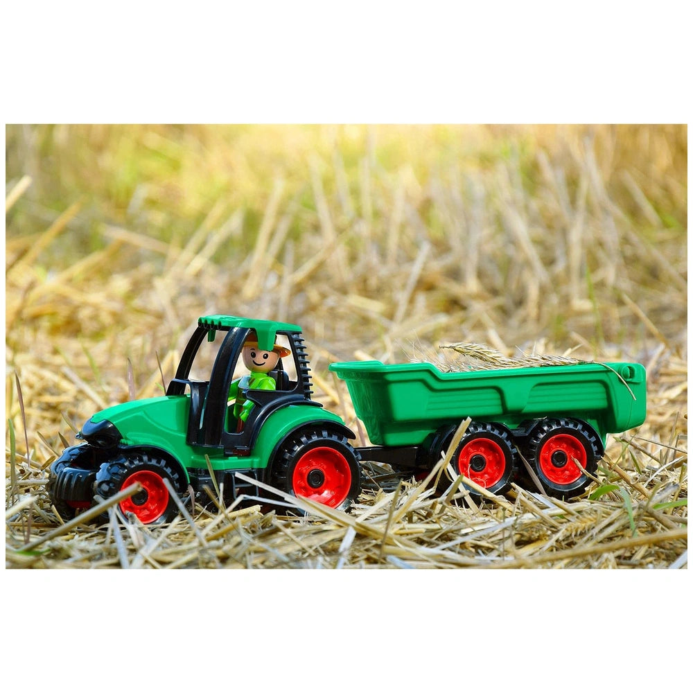 The tractor comes equipped with a tilting driver's cabin, allowing young ones to easily access the interior for role-playing adventures. The functional trailer features a tipping mechanism and a rear hatch, making it perfect for transporting various toys or even small treasures found during playtime. This interactive feature adds an extra layer of excitement, as children can engage in realistic farming scenarios or imaginative journeys across their play area.