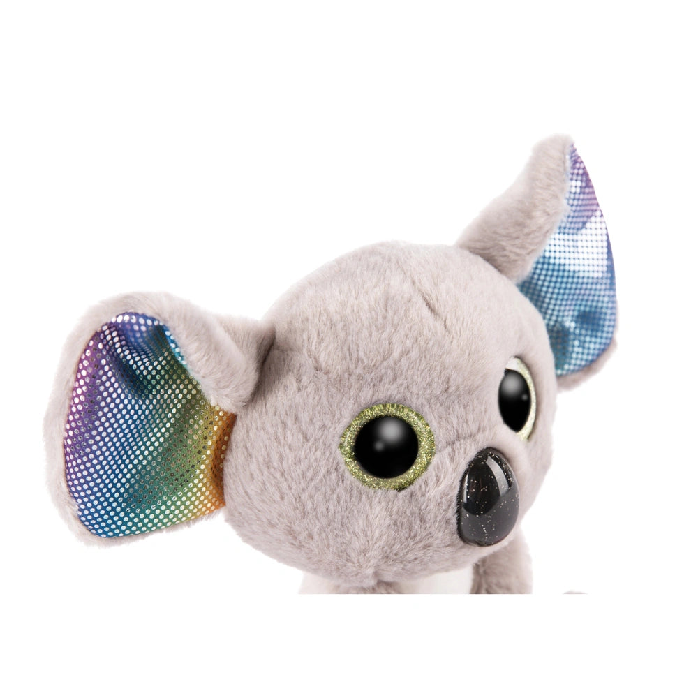 The GLUBSCHIS Koala Miss Crayon stands out with her striking gray and white fur, complemented by her whimsical rainbow-colored ears and feet. These colorful accents are made from glitter material, adding a touch of sparkle that makes her even more enchanting. Her expressive green-rimmed glitter eyes are designed to engage and delight, making her the perfect companion for imaginative play or as a comforting presence during bedtime.