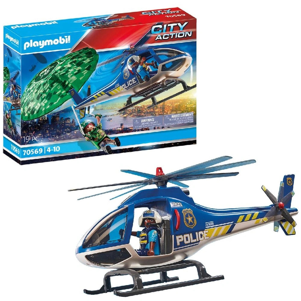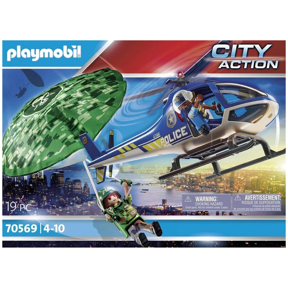 Introducing the Playmobil City Action Police Helicopter - Parachute Chase - 70569, an exhilarating playset designed to ignite the imagination of young crime fighters. This dynamic set features 19 meticulously crafted pieces, including two detailed figures: a brave police officer and a cunning villain. The centerpiece of this thrilling chase is the police helicopter, equipped to pursue the escaping criminal as he attempts to flee with a parachute. This engaging scenario not only provides hours of entertainment but also encourages creative storytelling and role-playing.