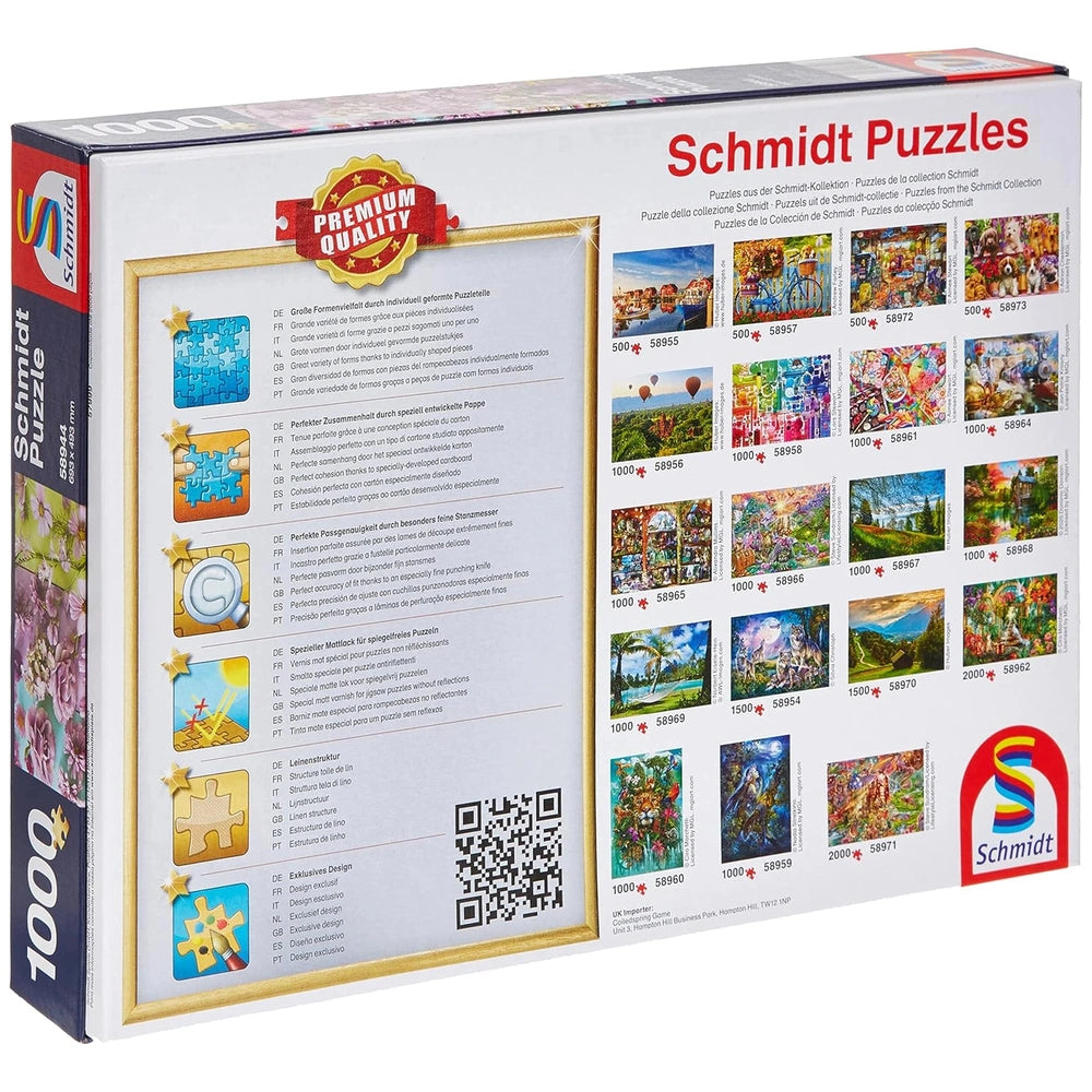 The Schmidt Puzzle: Violet Blossoms features a breathtaking composition of flowers that radiate elegance and charm. With 1000 meticulously crafted pieces, this puzzle offers a satisfying challenge for both novice and experienced puzzlers alike. The rich hues and intricate details of the floral arrangement create a visually stimulating experience, encouraging you to take your time and savor each moment as you piece together this stunning tableau.
