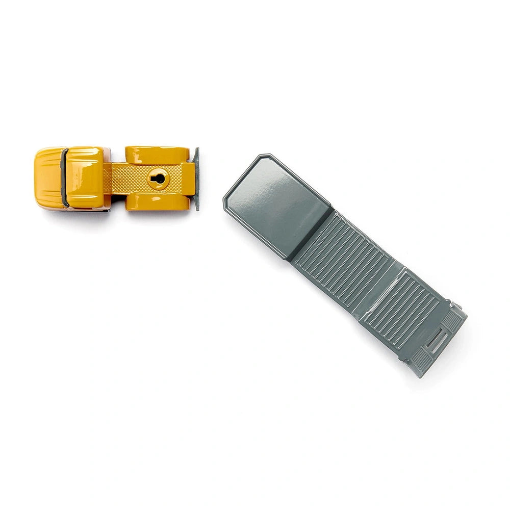 Introducing the Siku Low Loader with Front Loader, a meticulously crafted play vehicle designed to ignite the imagination of young builders and transport enthusiasts. This exceptional toy combines the durability of metal and plastic parts, ensuring that it withstands the rigors of play while providing an authentic experience. The low loader is specifically engineered for the safe transport of a SIKU loader, making it an essential addition to any child's toy collection.