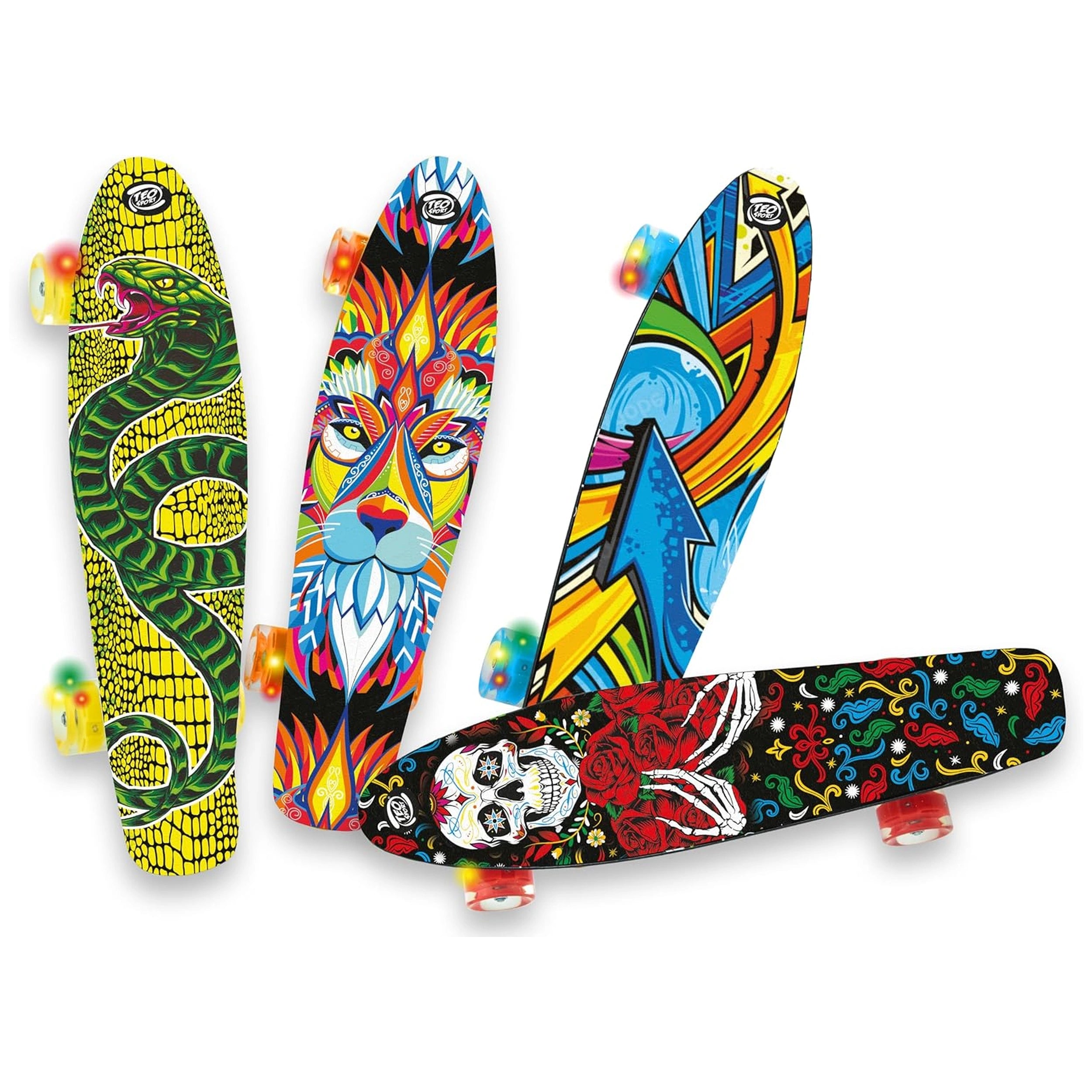 Introducing the Teo Sport LED Light-Up Mini Cruiser Skateboard, a vibrant and dynamic choice for both beginners and seasoned riders. This compact 56cm (22-inch) penny board is designed to make your outdoor adventures not only fun but also stylish. With its eye-catching graphics featuring a Green Snake, Tribal Lion, Graffiti Arrow, and Skull and Roses, this skateboard is sure to turn heads as you glide through the streets. The combination of portability and striking design makes it an essential addition to your outdoor play equipment.